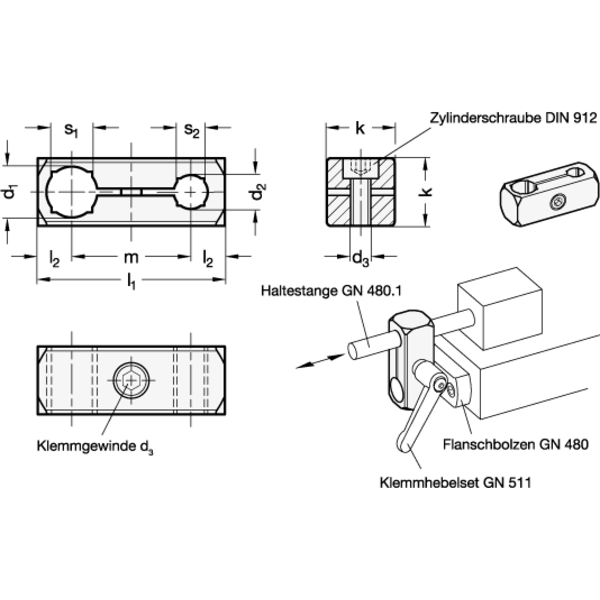 Die Klemmschraube ist in der Standardausführung eine Zylinderschraube mit Innensechskant DIN 912. Sie kann durch ein Klemmhebelset GN 511 ersetzt werden (Bestellbezeichnung siehe Maßtabelle).
