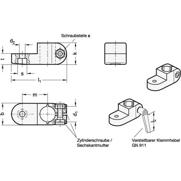 An der Schraubstelle z verkleinert die Zylinderschraube den Bohrungsquerschnitt zum Klemmen. Wenn werkzeuglos geklemmt werden soll, kann die Zylinderschraube, durch einen in der Tabelle als Zubehör angegebenen verstellbaren Klemmhebel GN 911 ersetzt werden.