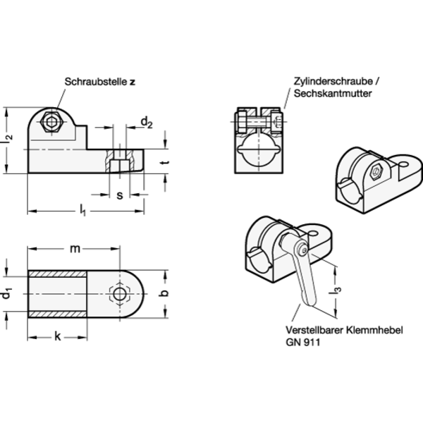 An der Schraubstelle z verkleinert die Zylinderschraube den Bohrungsquerschnitt zum Klemmen. Wenn werkzeuglos geklemmt werden soll, kann die Zylinderschraube, durch einen in der Tabelle als Zubehör angegebenen verstellbaren Klemmhebel GN 911 ersetzt werden.