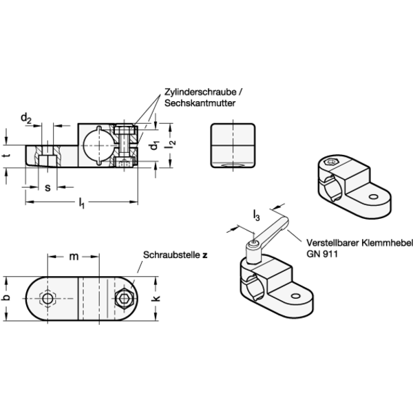 An der Schraubstelle z verkleinert die Zylinderschraube den Bohrungsquerschnitt zum Klemmen. Wenn werkzeuglos geklemmt werden soll, kann die Zylinderschraube, durch einen in der Tabelle als Zubehör angegebenen verstellbaren Klemmhebel GN 911 ersetzt werden.