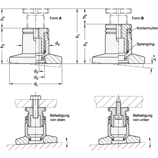 Zur Befestigung von unten kann das Gewinde d2 auch als Durchgangsbohrung genutzt werden. Über das Feingewinde d3 ist ein präzise Ein- bzw. Nachstellung mittels Hakenschlüssel DIN 1810 möglich. Ein Sprengring begrenzt den max. Verstellweg.