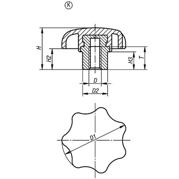 STERNGRIFF MIT VORSTEHENDER BUCHSE D=1/2-13, D1=63, H=40, FORM:K MIT GEWINDEB...