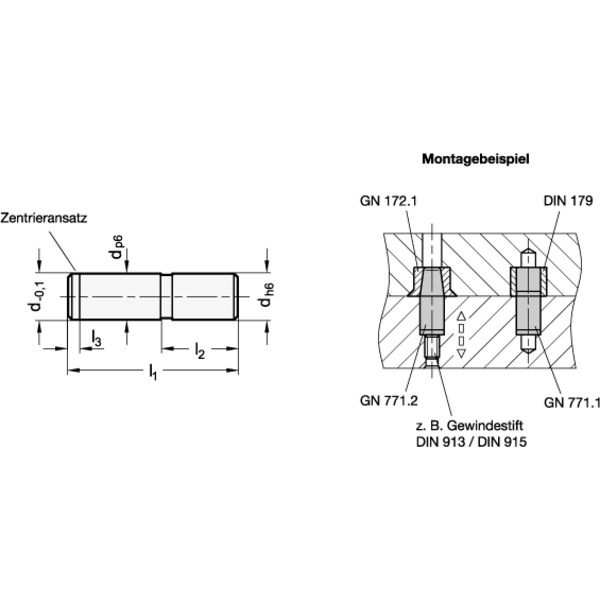 Positionierstifte GN 771.1 werden in Verbindung mit Positionierbuchsen DIN 172 / DIN 179 eingesetzt.