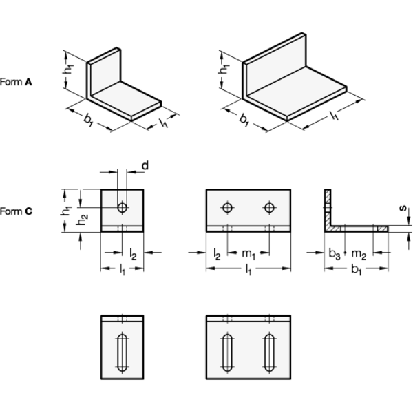 Die Montage-Winkel Form C sind in Abhängigkeit der Länge l1 mit einer oder zwei Kombinationen aus Bohrung und Langloch versehen.