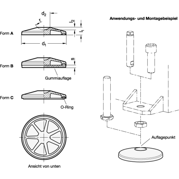 Die Form B mit Gummiauflage verhindert seitliches Verrutschen, schützt empfindliche Oberflächen und dämpft Vibrationen und Erschütterungen. Bei der Form C mit O-Ring wird eine Abdichtung gegenüber dem Boden erreicht, sodass Verschmutzungen unter dem Fuß verhindert werden.
