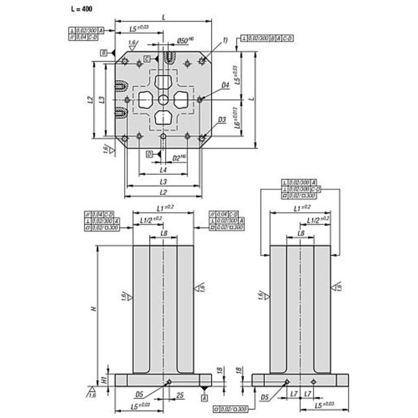 AUFSPANNTURM 4-SEITIG, M.VORBEARB.AUFSPANNFLÄCHEN, FORM:A, L=400, L1=251, H=500, GJL300
