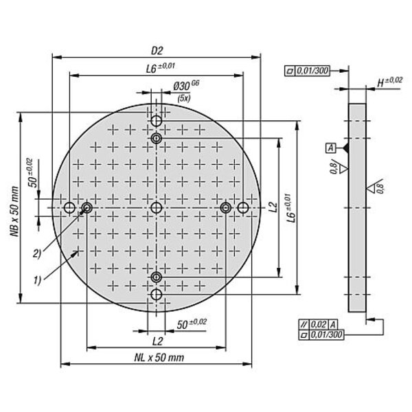 GRUNDPLATTE MIT RASTERBOHRUNGEN, RUND, FORM:B, D2=600, H=50, D1=M12, GJL300