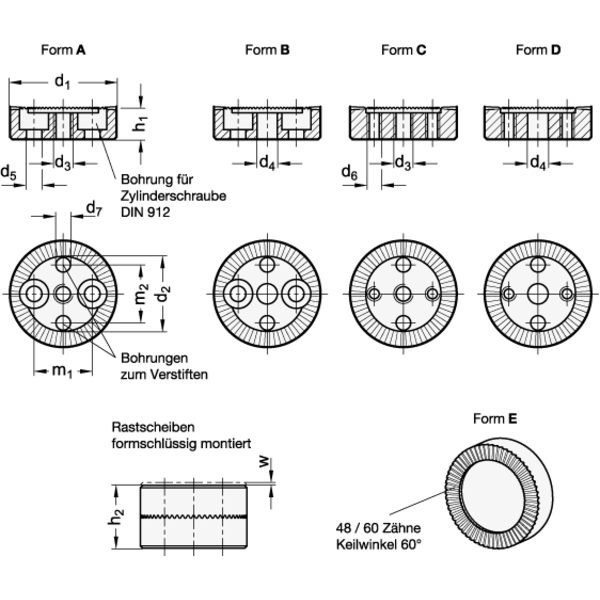 Die Winkellage der Verzahnung ist auf die Befestigungsbohrungen ausgerichtet, wodurch eine parallele oder rechtwinklige Anordnung gewährleistet wird. Die Zähnezahl von 48 / 60 ermöglicht eine Verstellung in 7,5° bzw. 6°-Schritten, woraus sich die in der separaten Tabelle aufgeführten Rastpositionen ergeben.