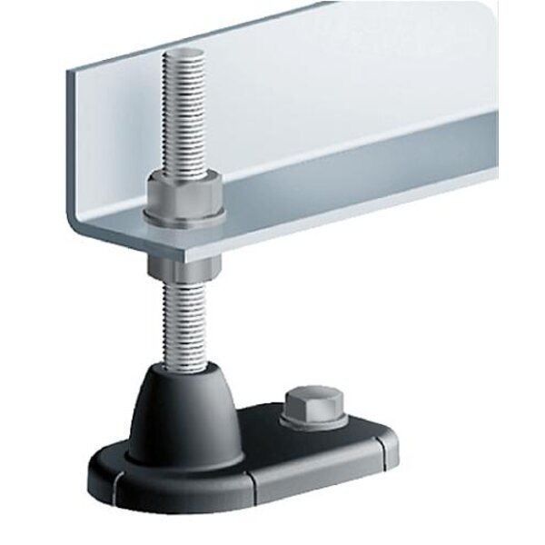 Stabiler Stellfuß, der für Förderanlagen besonders geeignet ist. Mit angebrachten Ausrichtmarkierungen zum exakten Positionieren der Entenfüße.