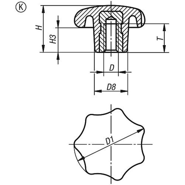 STERNGRIFF ÄHNLICH DIN6336 D=M10, D1=50, H=32, FORM:K MIT GEWINDEBUCHSE, DURO...