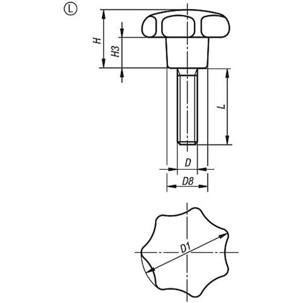 STERNGRIFF ÄHNLICH DIN6336 M10X50, D1=50, H=32, FORM:L MIT AUßENGEWINDE, DURO...