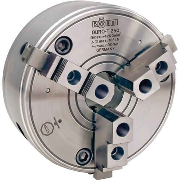 DURO-T Keilstangenfutter werden in Bereichen erfolgreich eingesetzt, die extrem hohe Spannkräfte, eine hohe Rundlaufgenauigkeit und verläßliche Dauer-Wiederholgenauigkeit erfordern mit zylindrischer Zentrieraufnahme · für Drehmaschinen · in Verbindung mit einer Grundplatte stationärer Einsatz auf Fräsmaschinen · Teilapparate und Bearbeitungszentren · die Backen lassen sich schnell und einfach wenden, austauschen oder über den ganzen Spannbereich versetzen · die Genauigkeit der Backen bleibt erhalten, wenn diese nur auf dem gleichen Futter eingesetzt und Grund- und Aufsatzbacken, für wiederkehrende Arbeiten, verschraubt aufbewahrt werden. Technische Merkmale: · mit Backensicherung · Futterkörper steifer (garantiert Genauigkeit bei höherer Belastung) · Sichtmarkierung für Backen-Schnellverstellung · Außenform inkl. Spritzwasserkante · Rund- und Planlauftoleranz doppelt so genau wie bei DIN-Genauigkeitsklasse 1 gefordert · Befettungsmöglichkeiten der stark beanspruchten Gleitflächen · mit Sicherheitsschlüssel (Forderung nach EN 1550) Vorteile: · höhere Spannkraft · hohe Backenwechselwiederholgenauigkeit · Optimierung der Verschleißteile · höherer Korrosionsschutz · Grund- und Aufsatzbacken anderer Hersteller kompatibel · Weitere technische Eigenschaften Ausführung: mit einteiligen Umkehrbacken ¿ DIN: DIN 55026, DIN 55021 · ASA B 5.9 ¿ Ø: 315 mm ¿ Montageart: Befestigung vorne