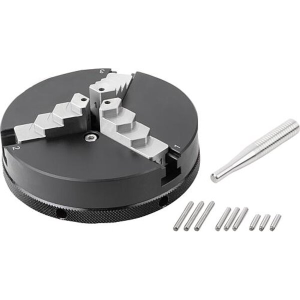 Backenfutter D=104 mit Bedienwerkzeug und je drei Stiften (Ø 3 mm) mit Länge 12 , 18 und 24 mm.