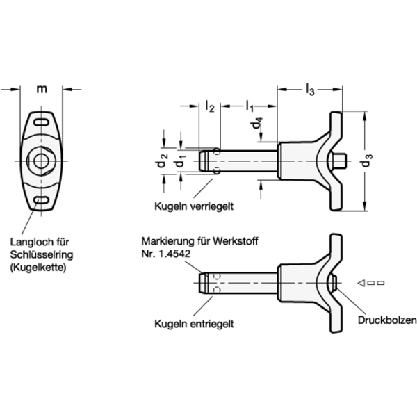 Kugelsperrbolzen, Bolzen Edelstahl 1.4542, T-Griff Kunststoff