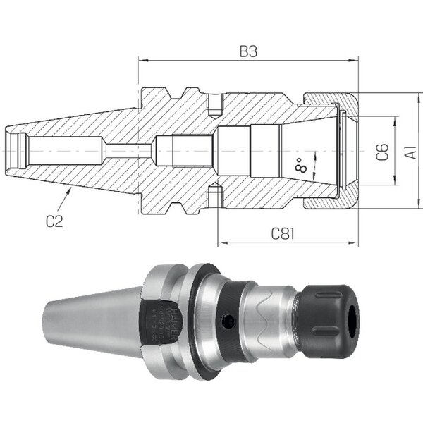Auch für Standard-Spannzangen ER nach ISO 15488. Achtung: Bei Verwendung von Standard ER Spannzangen wird das A-Maß länger