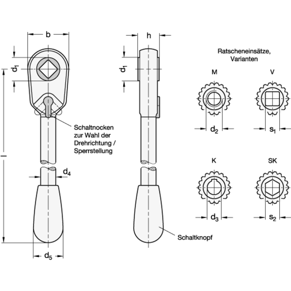 In der Sperrstellung des Schaltnockens (mittige Position) ist die Ratschenfunktion ausgeschaltet, es kann in beiden Drehrichtungen ein Drehmoment übertragen werden.