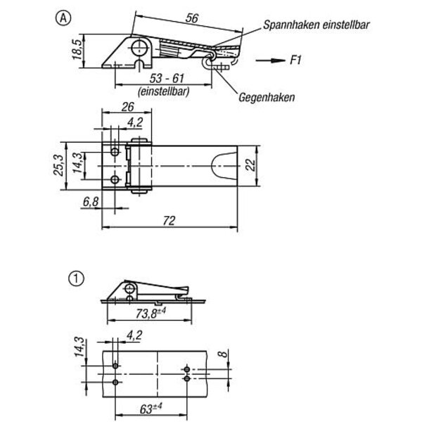 Die Haltekraft F1 bezieht sich auf den Spannverschluss nicht auf den Gegenhaken.