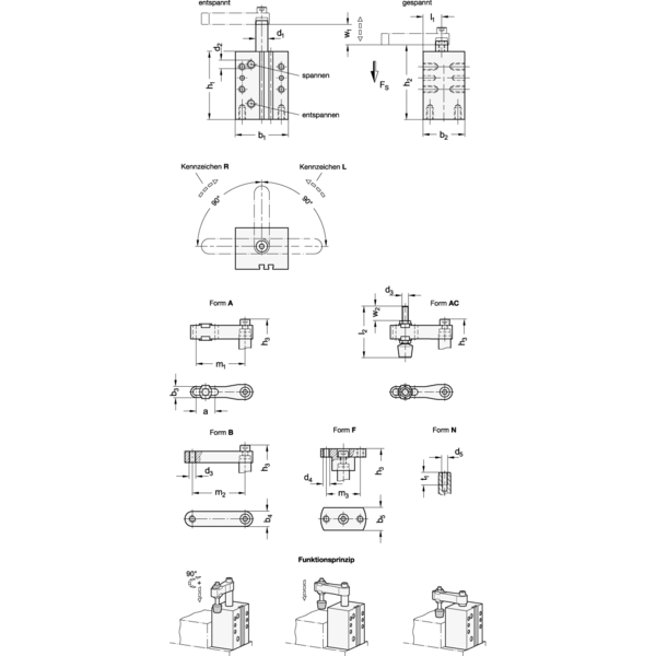 Beim Spannvorgang erfolgt zuerst eine 90°-Schwenk-Hub-Bewegung nach unten, anschließend folgt der lineare Spannhub. Die Werkstückspannung darf nur innerhalb des Spannhubes erfolgen.