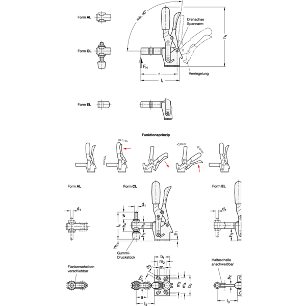 Schnellspanner mit offenem Spannarm nehmen in der Form AL über die Flankenscheiben eine anwendungsspezifische Schraube auf, bei der Form CL ist zusätzlich eine Andrückschraube mit Gummi-Druckstück im Lieferumfang enthalten.
