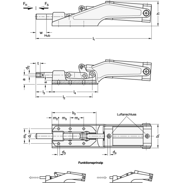 Die Spannmechanik der Schnellspanner GN 890 entspricht in Aufbau und Abmessungen der von handbetätigten Schubstangen-Spannern GN 842.