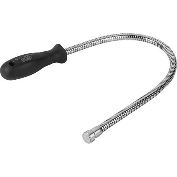 Starker Permanent-Magnet mit biegsamen Messingschlauch und schwarzem Kunststoffgriff. Oberfläche verchromt.