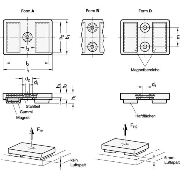 Haltemagnete GN 57.2 mit Gummiummantelung bilden im Verbund mit dem Stahlteil ein besonders starkes System, welches den Magnet schirmt, in der Wirktiefe verstärkt und den magnetischen Fluss optimal auf die gummierten Haftflächen konzentriert. Damit eignen sich diese Magnete besonders für den Einsatz auf Flächen die z. B. mit dicken Lackschichten versehen sind oder eine runde bzw. unebene Form aufweisen.