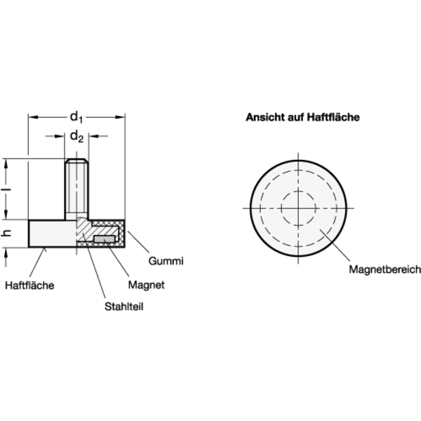 Haltemagnete GN 51.3 mit Gummiummantelung bilden im Verbund mit dem Stahlteil ein System, welches den Magnet schirmt, verstärkt und den magnetischen Fluss optimal auf die gummierte Haftfläche konzentriert.
