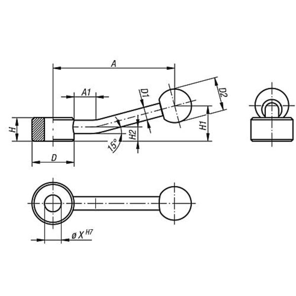 SPANNHEBEL FLACH GR.2, 12H7, A=100, FORM:15° STAHL, KOMP:DUROPLAST