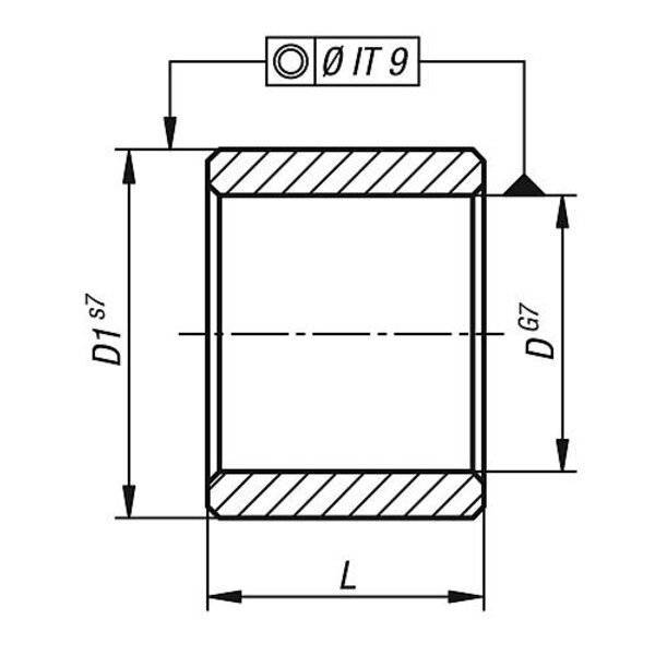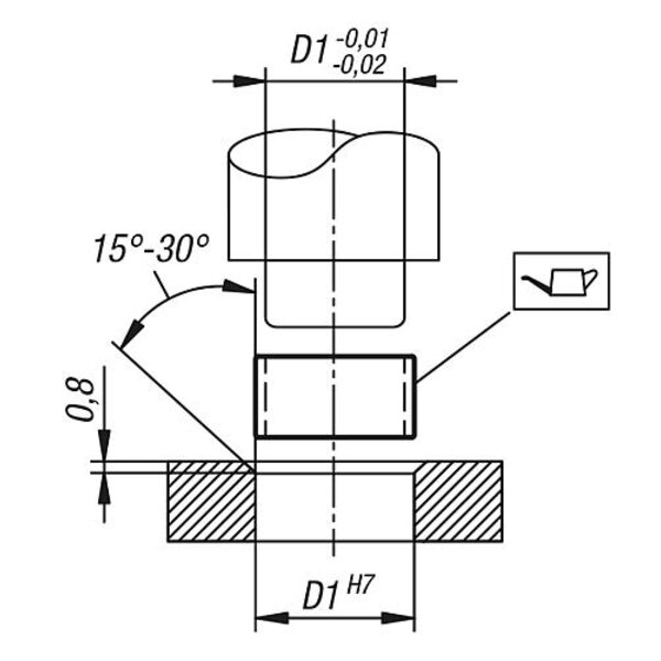 Gleitlager einpressen, nicht einschlagen. Die Verwendung eines passenden Einpressdorns wird empfohlen. Ohne Einpressdorn besteht die Gefahr, dass sich das Gleitlager beim Einbau verformt. Nach dem Einpressen in ein Gehäuse mit Aufnahmebohrung H7, weist die Bohrung D eine Toleranz H7 auf.
