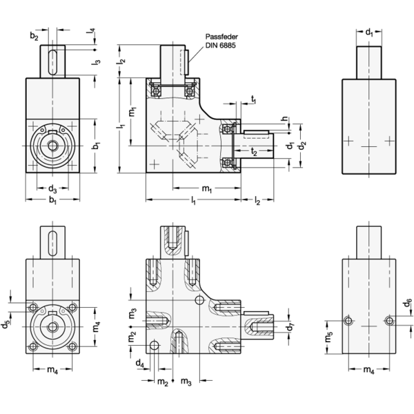 Durch die zahlreichen Befestigungsbohrungen wird eine einfache Montage in beliebiger Lage ermöglicht. Die Winkellagen der Passfedern sind beliebig angeordnet.
