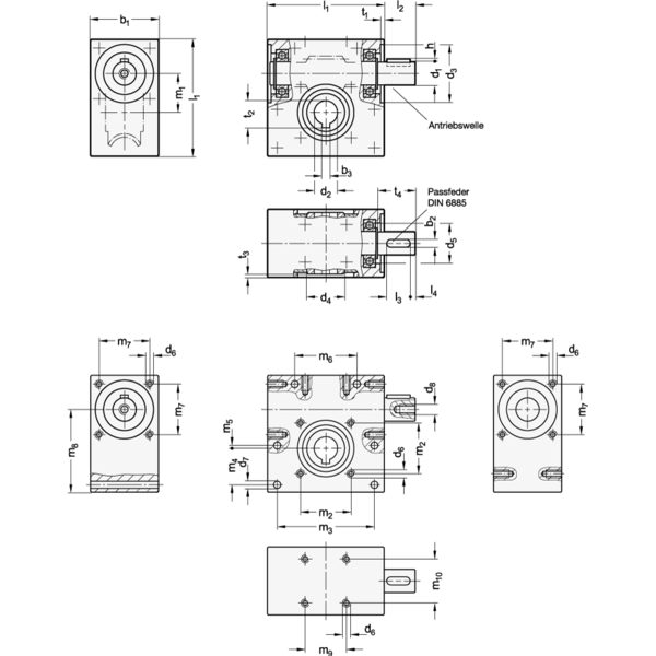 Durch die zahlreichen Befestigungsbohrungen wird eine einfache Montage in beliebiger Lage ermöglicht. Die Winkellagen der Passfedern sind beliebig angeordnet.
