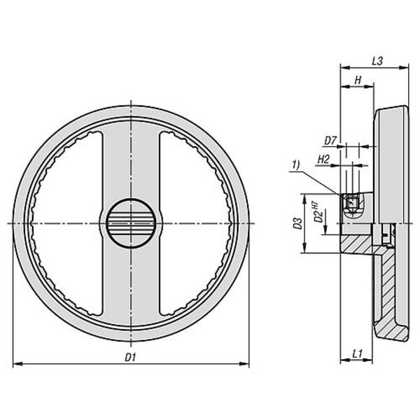 Die Handräder können durch Querverstiftung oder durch eine Zylinderschraube DIN 6912 und eine Vorlegscheibe K0173 axial durch Passfederverbindung auf der Welle befestigt werden.