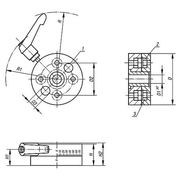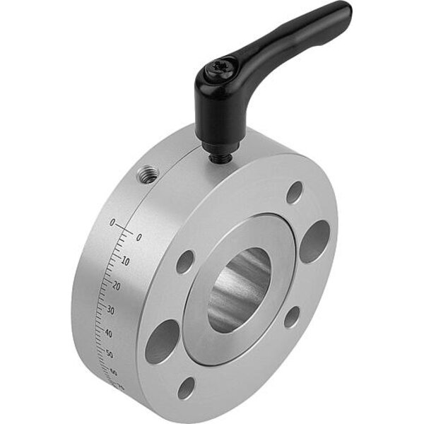 Durch Lösen des Klemmhebels kann die Drehscheibe auf dem Grundkörper gedreht werden. Drehbar um 360°. Die Drehscheibe rastet alle 90° ein (21150-25 alle 45°). Die Rasterung besteht aus einem Kugeldruckstück, welches einfach entfernt werden kann.