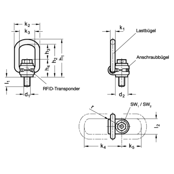 Die drehbaren Lastbügel GN 586.1 sind klappbar, allseitig drehbar und nehmen die volle Last in jeder zugelassenen Zugrichtung auf.