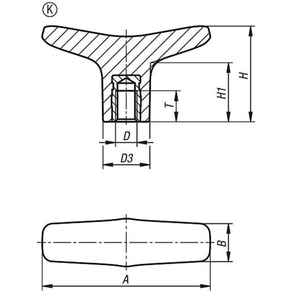 T-GRIFF D=M06, A=65,1, B=14,6, H=37, FORM:K DUROPLAST HOCHGLANZPOLIERT, SCHWARZ, KOMP:STAHL BLAU-PASSIVIERT