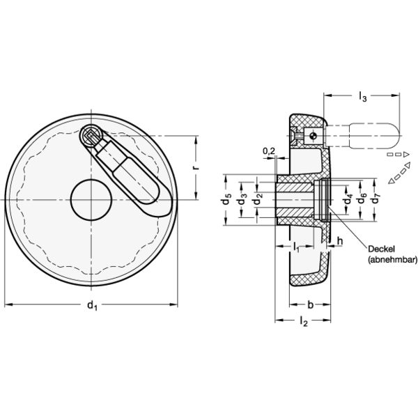Bei Umleggriff-Handrädern GN 521.3 ist der Griff in der Bedienstellung in einer konischen Bohrung arretiert.