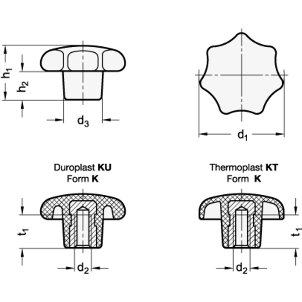 Sterngriffe DIN 6336 mit Bohrung H7 sind unter den Normen GN 6336.1 und GN 6336.2 lieferbar.