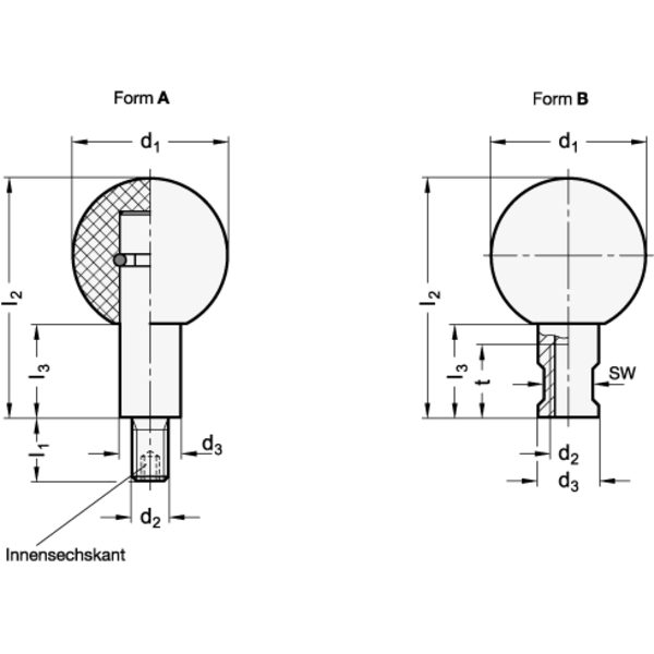 Drehbare Kugelknöpfe GN 319.5 werden vorzugsweise eingesetzt, wenn der "Zugriff" in Achsrichtung erfolgt, z.B. bei vertikalem Anbau von Handrädern.