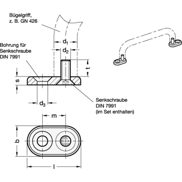 Befestigungssätze GN 181 ermöglichen bei verschiedenen Bügelgriffen mit Innengewinde die Befestigung von der Bedienseite.