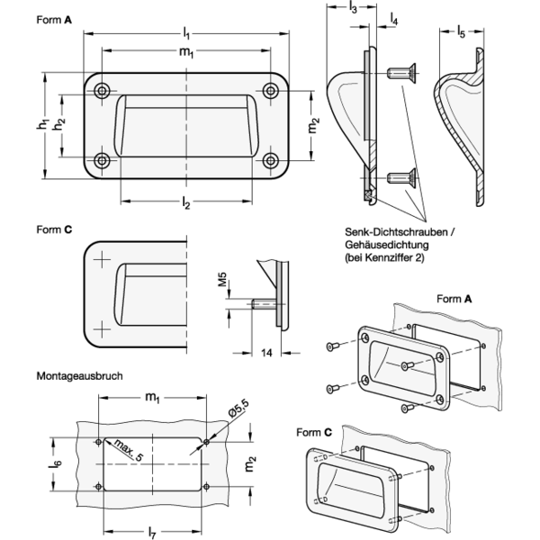 Griffschalen mit Gehäusedichtung (Kennziffer 2) verhindern jegliches Eindringen von Schmutz und Flüssigkeiten in den Gehäuseinnenraum. Die Form A wird mit vier zusätzlichen Senk-Dichtschrauben geliefert, die zur Abdichtung mit einer Polyamid-Beschichtung am Kopf versehen sind.