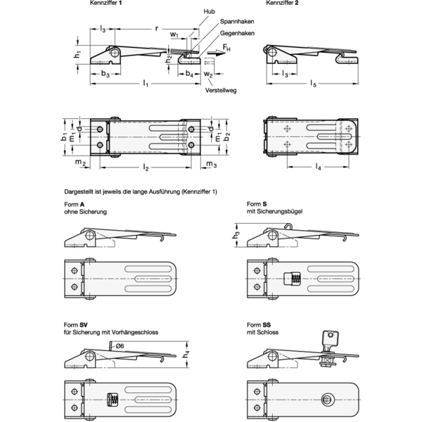 Die in der Tabelle angegebene Haltekraft ist ein Richtwert für die mögliche statische Zugbeanspruchung des Spannverschlusses. Je nach Einsatzbedingung, z.B. durch Vibrationen oder schlagartige Beanspruchung, kann die Haltekraft beeinträchtigt sein.