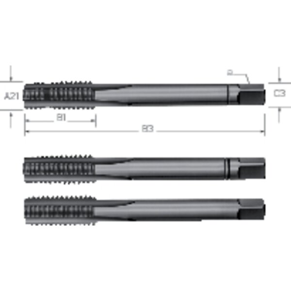 Vorschneider 6-8 Gang, Form A; Mittelschneider 3-5 Gang, Form D; Fertigschneider 2-3 Gang, Form C für Grundloch- und Durchgangsgewinde.
