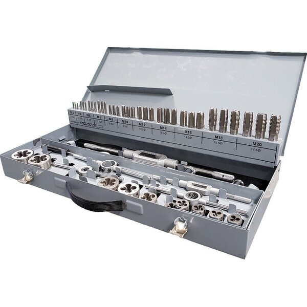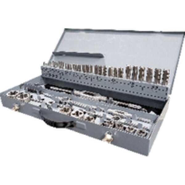 Gewindebohrer, Schneideisen und Betätigungswerkzeuge aus HSS in Metallkassette.