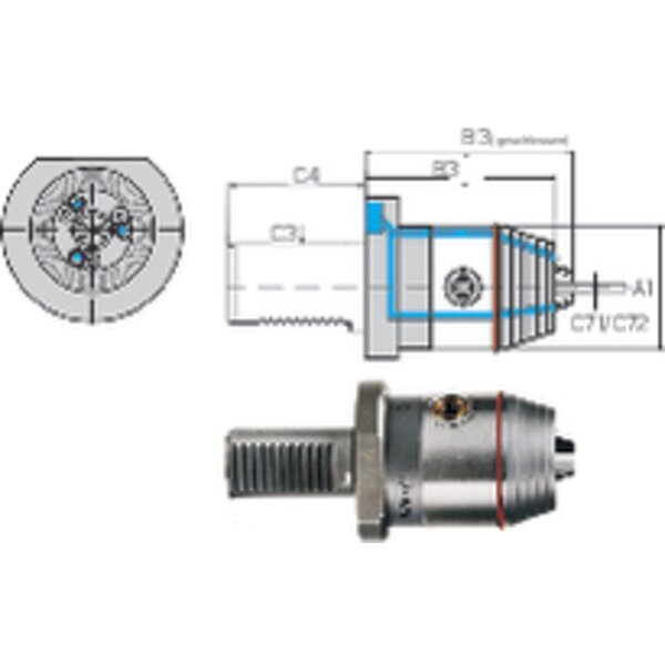 B: Dichtscheibe WTE 13 4,2 mm im Bohrfutterkopf eingebaut. Für Kühlkanalbohrer 6 - 13 mm, mit glatten Schaft nach DIn 6535 Form HA.