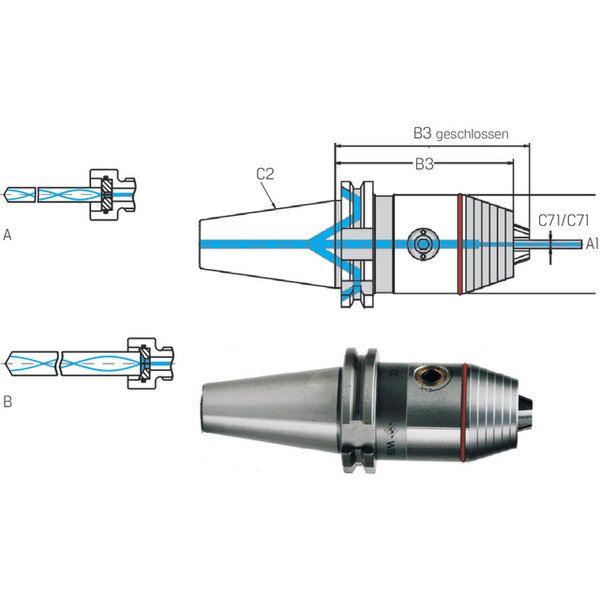 B: Dichtscheibe WTE 13 4,20 mm im Bohrfutterkopf eingebaut. Für Kühlkanalbohrer 6-13 mm, mit glattem Schaft nach DIN 6535 Form HA.