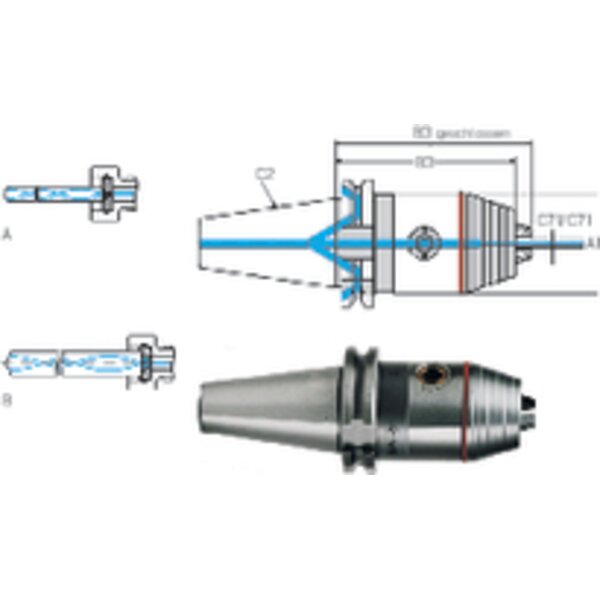 - Steilkegelschaft nach ISO 7388-1 Form AD bzw. Form AF mit innerer Kühlmittelzuführung wahlweise durch die Mitte (Form AD) oder über den Bund (Form AF) für automatischen Werkzeugwechsel