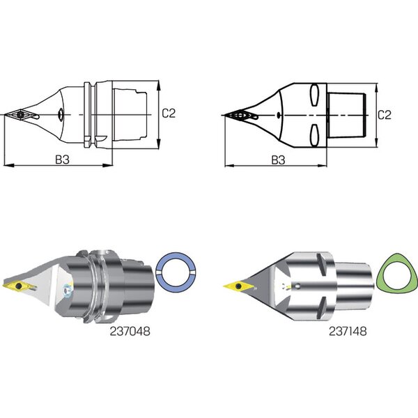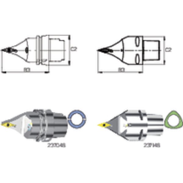 - Ausführungfür Drehbearbeitung, Kühlung durch ausgerichtete Kühldüse und Hochdruckkühldüse, Mitnehmernuten am HSK nach ICTM-Standard