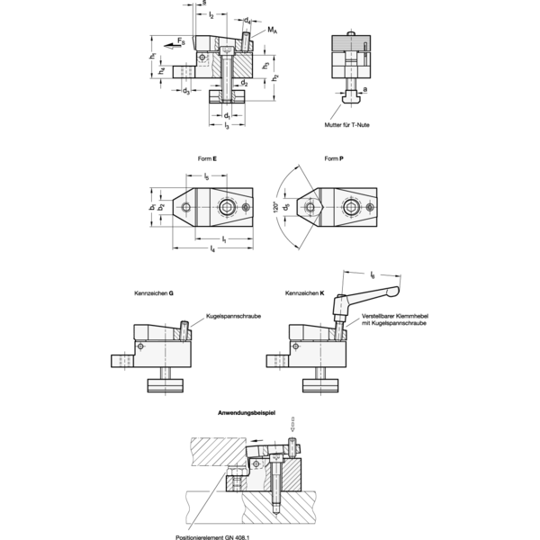 Mit Niederzugspannern GN 9190.2 werden Werkstücke mit einer drehbar gelagerten Spannbacke gespannt. Die Spannkraft wirkt dabei seitlich und von oben mit Niederzugseffekt auf das Werkstück und spannt dieses gegen Festanschläge sowie die Auflagefläche. Das in der Auflage integrierte Gewinde nimmt bei Bedarf beliebige Positionier- oder Stützelemente auf.