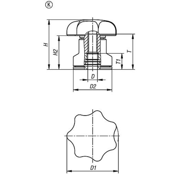 STERNGRIFF MIT SPANNKRAFTVERSTÄRKER D=M12, D1=63, H=47, FORM:K, THERMOPLAST S...