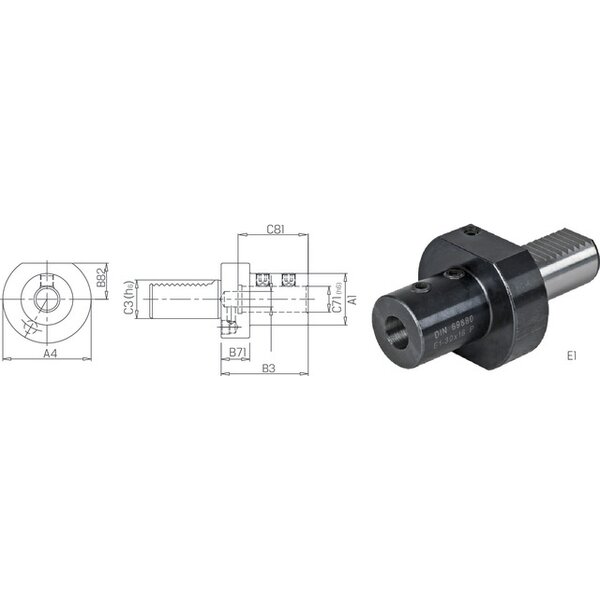 Werkzeughalter für Wendeplattenbohrer Form E1, mit innerer Kühlmittelzufuhr über Bund und geschliffener Anlagefläche.